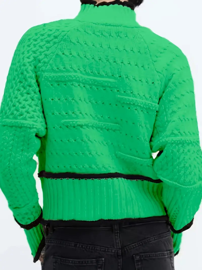 Ten modny damski sweter w jaskrawej zieleni to prawdziwy hit w Twojej garderobie. Unikalny wzór kabelkowy dodaje tekstury i stylu, a kontrastowe czarne detale nadają nowoczesny akcent.