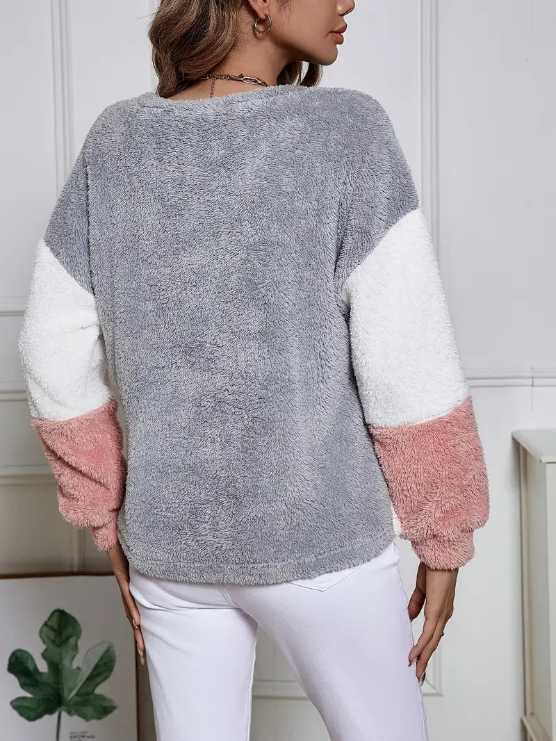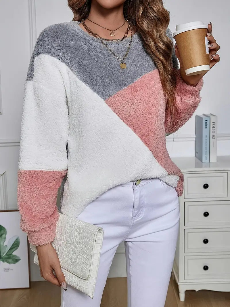 Ten damski sweter łączy styl i komfort w unikalny sposób. Modny design kolorowych paneli w szarości, różu i bieli nadaje mu zabawny, ale wyrafinowany wygląd. Miękka tkanina zapewnia maksymalny komfort noszenia.